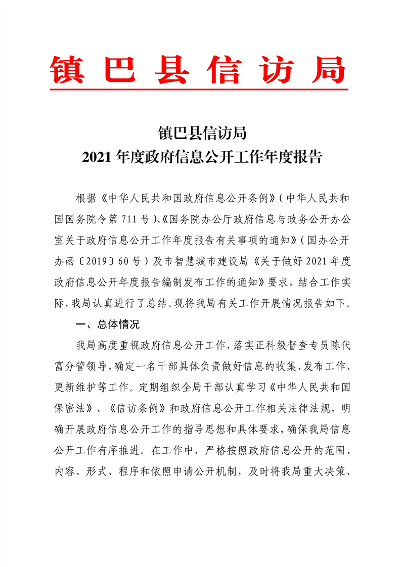 镇巴县信访局2021年度政府信息公开工作年度报告