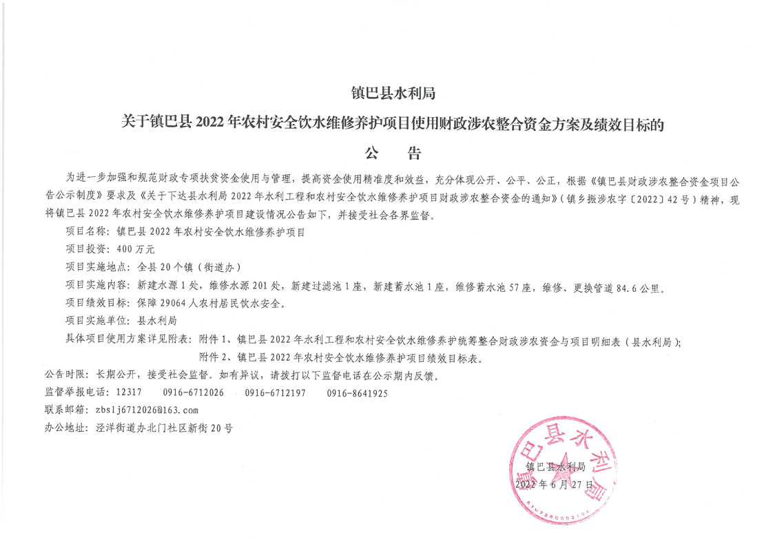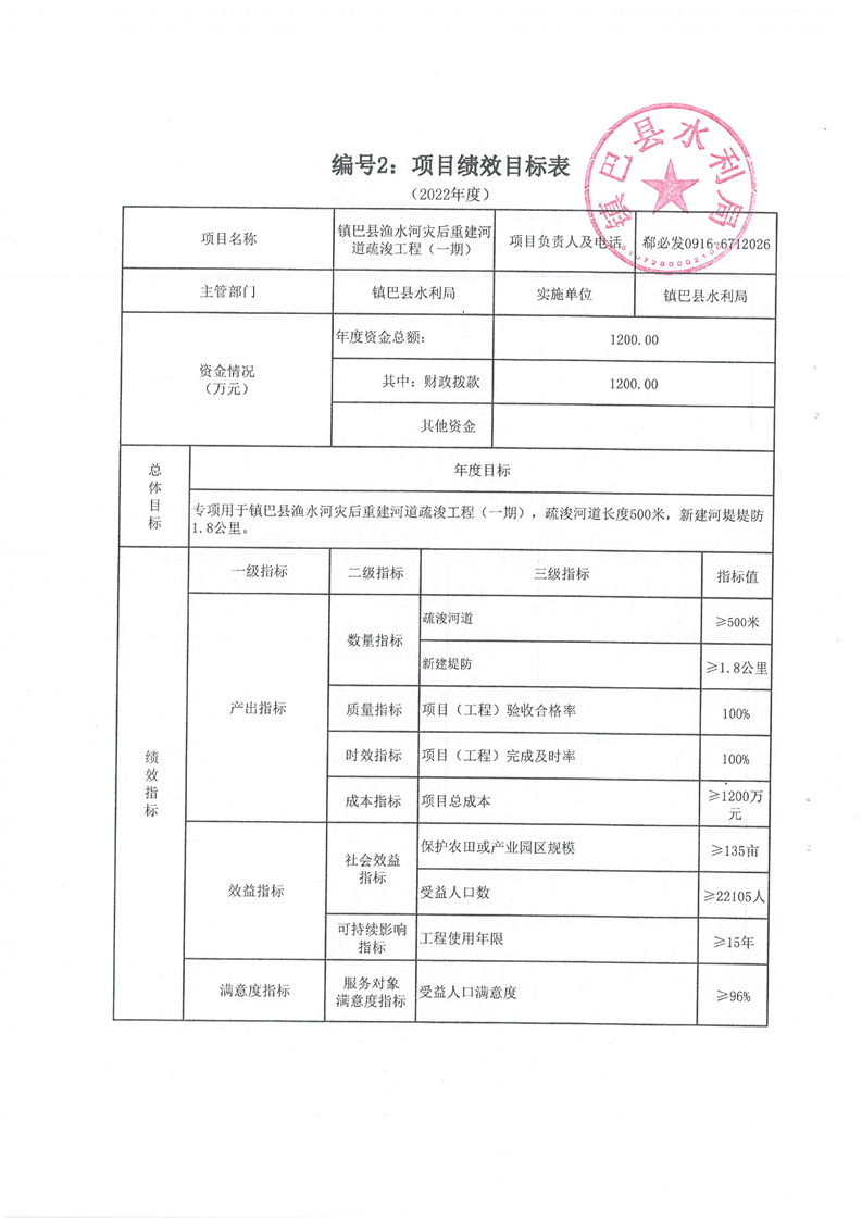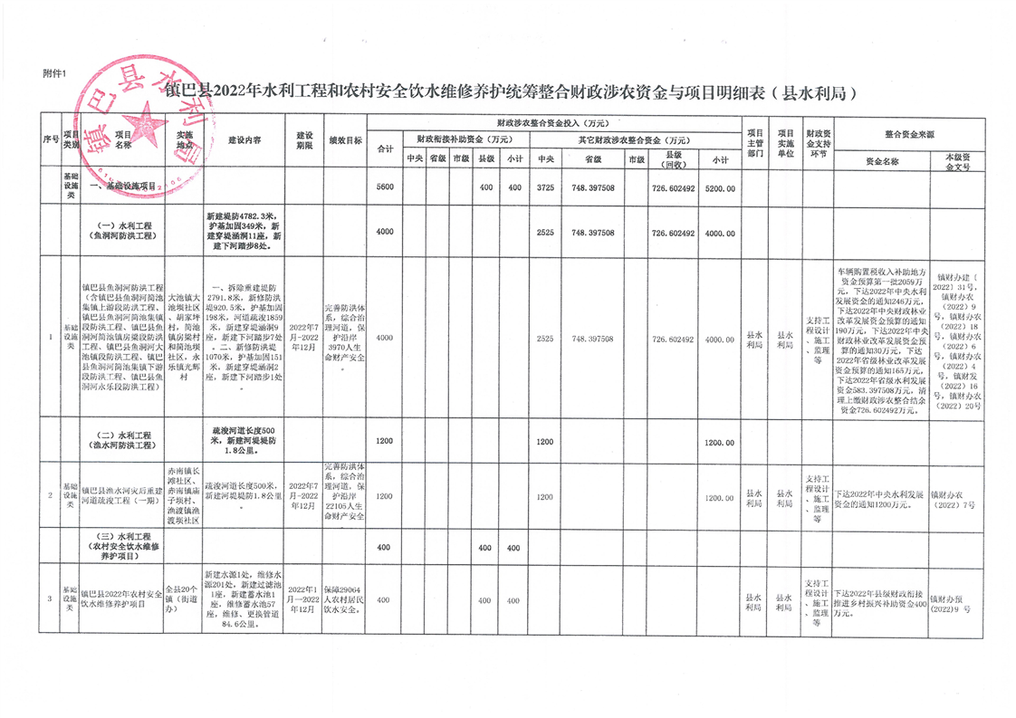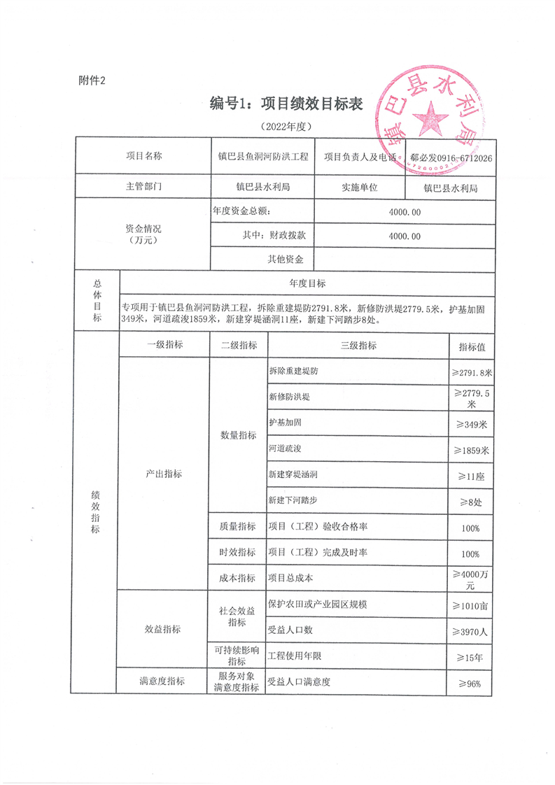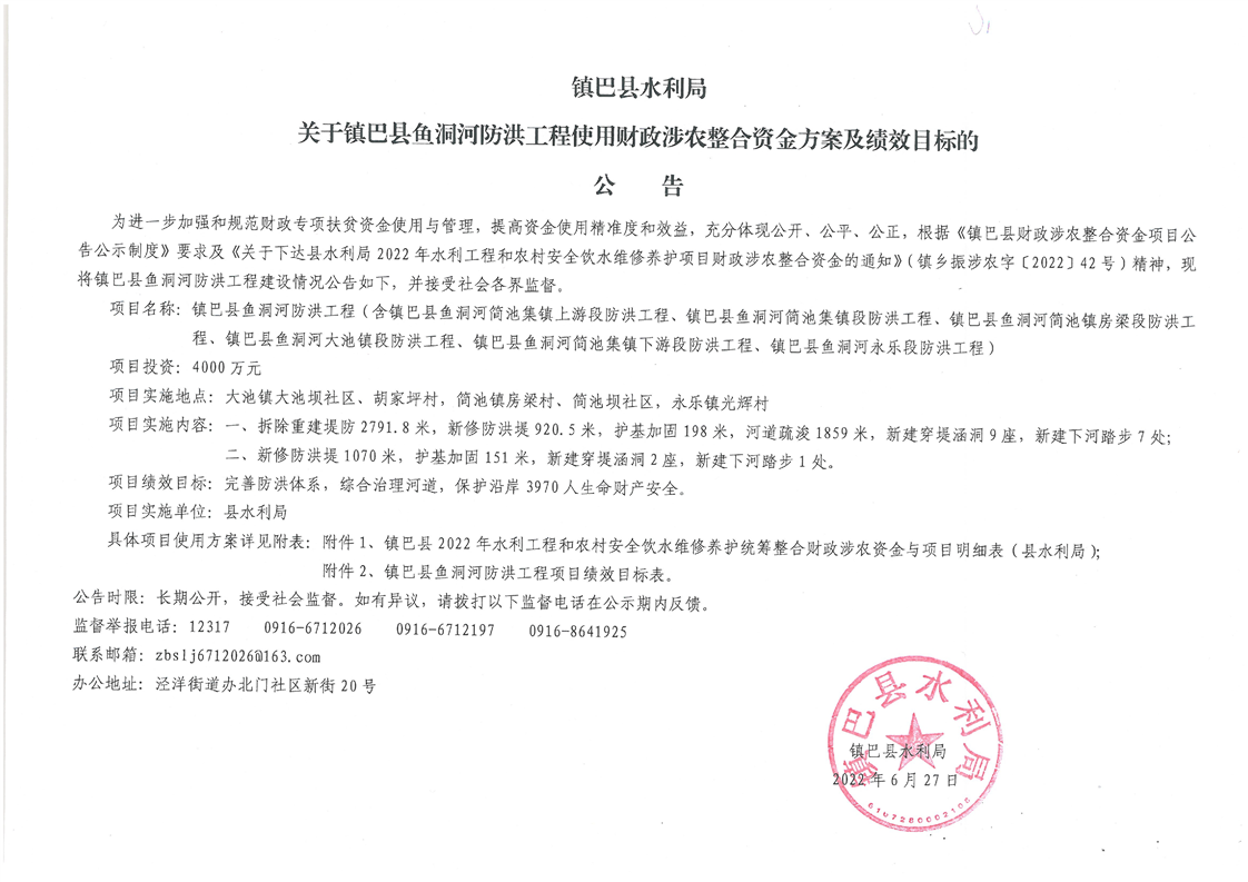 镇巴县水利局关于镇巴县鱼洞河防洪工程使用财政涉农整合资金方案及绩效目标的公告