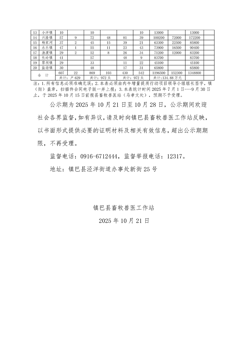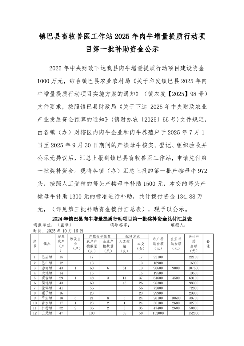镇巴县畜牧兽医工作站2025年肉牛增量提质行动项目第一批补助资金公示