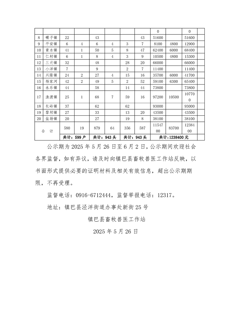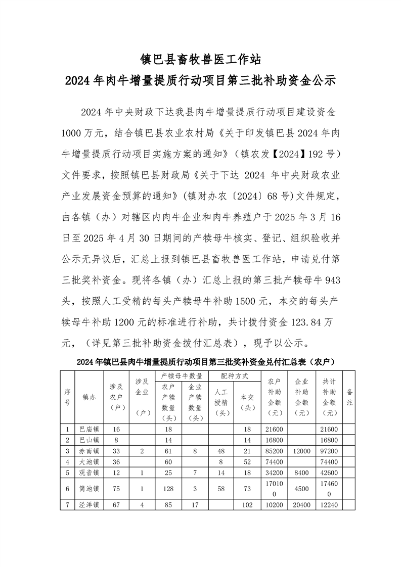 镇巴县畜牧兽医工作站2024年肉牛增量提质行动项目第三批补助资金公示