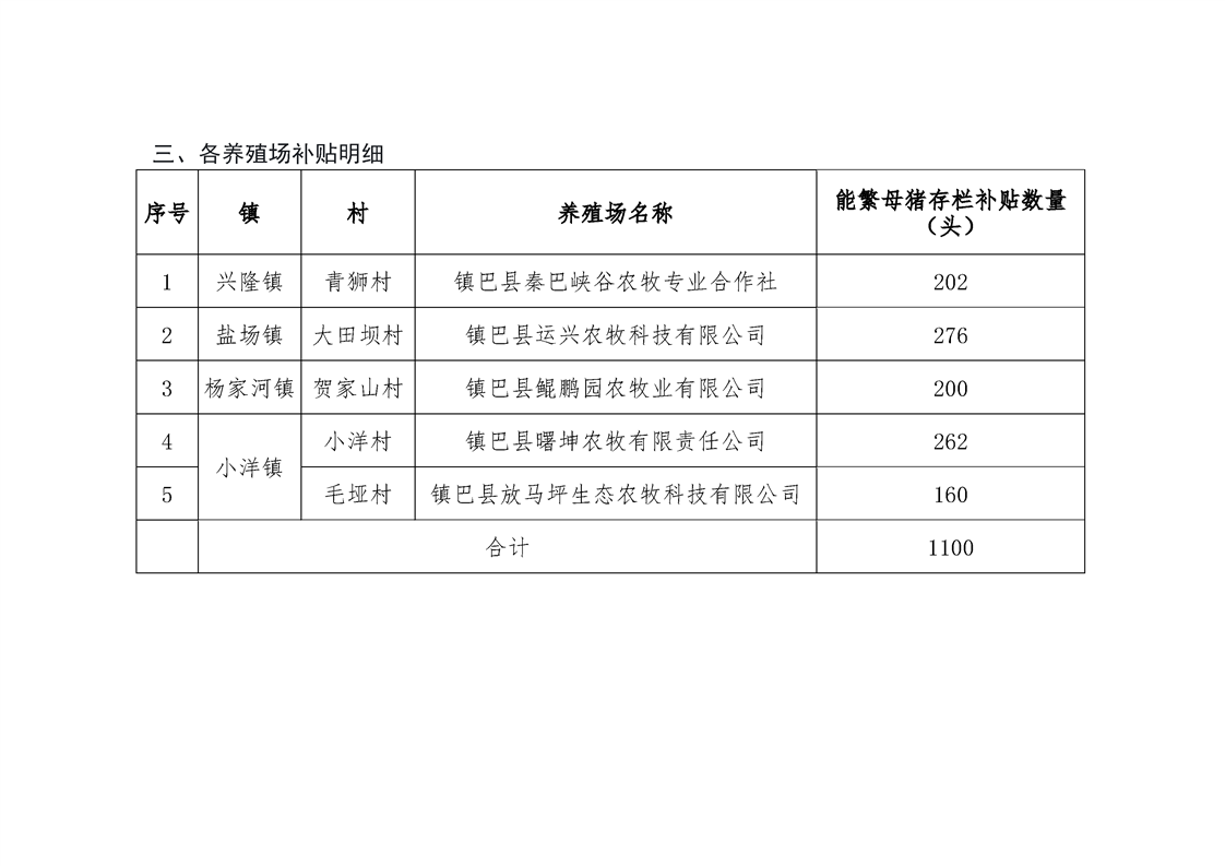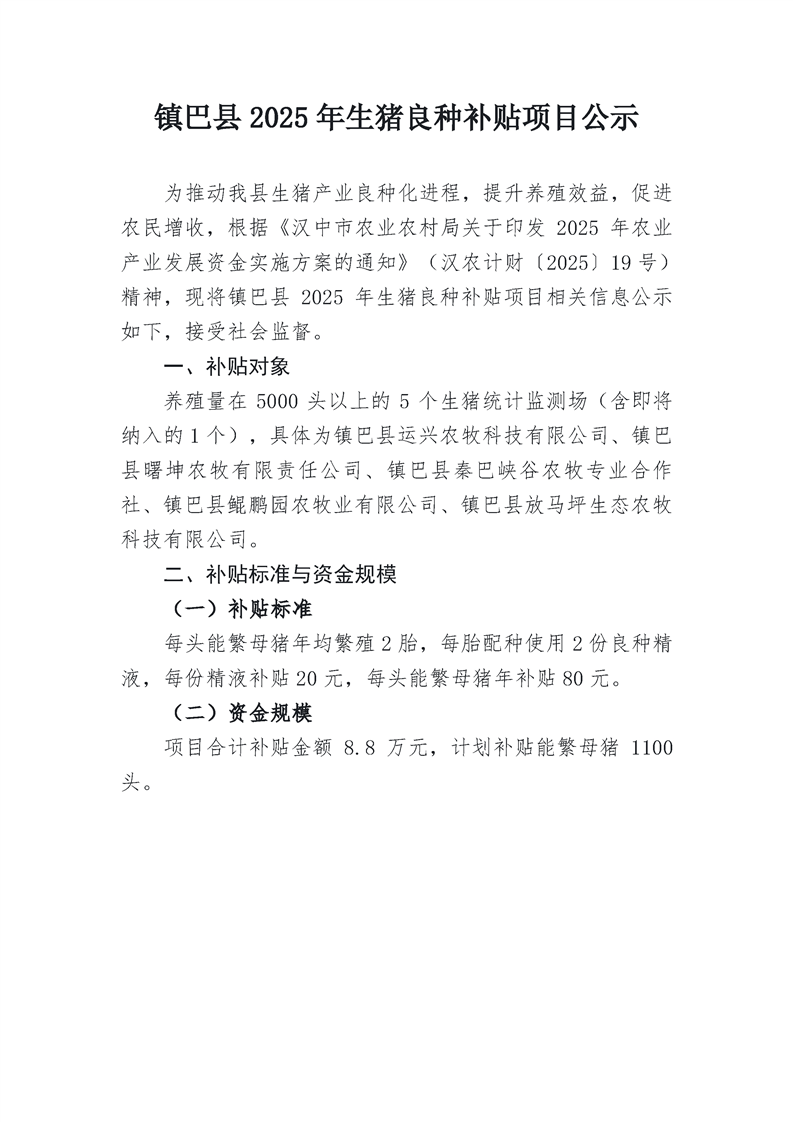 镇巴县2025年生猪良种补贴项目公示
