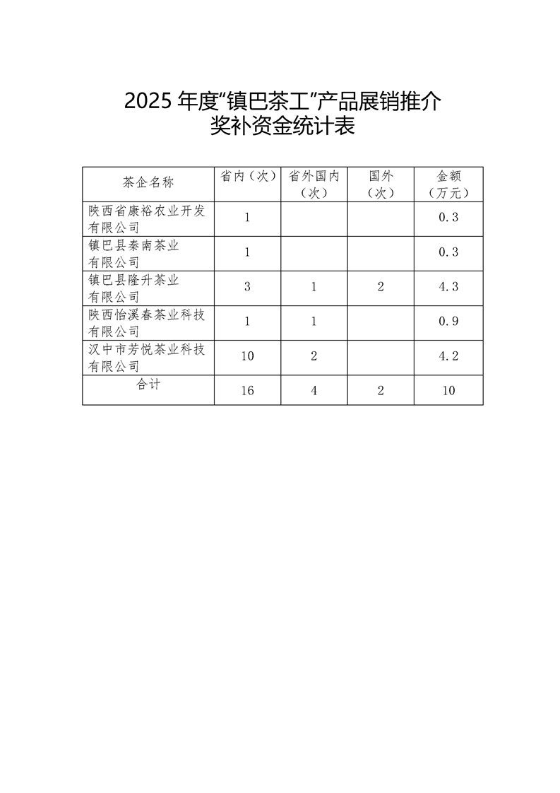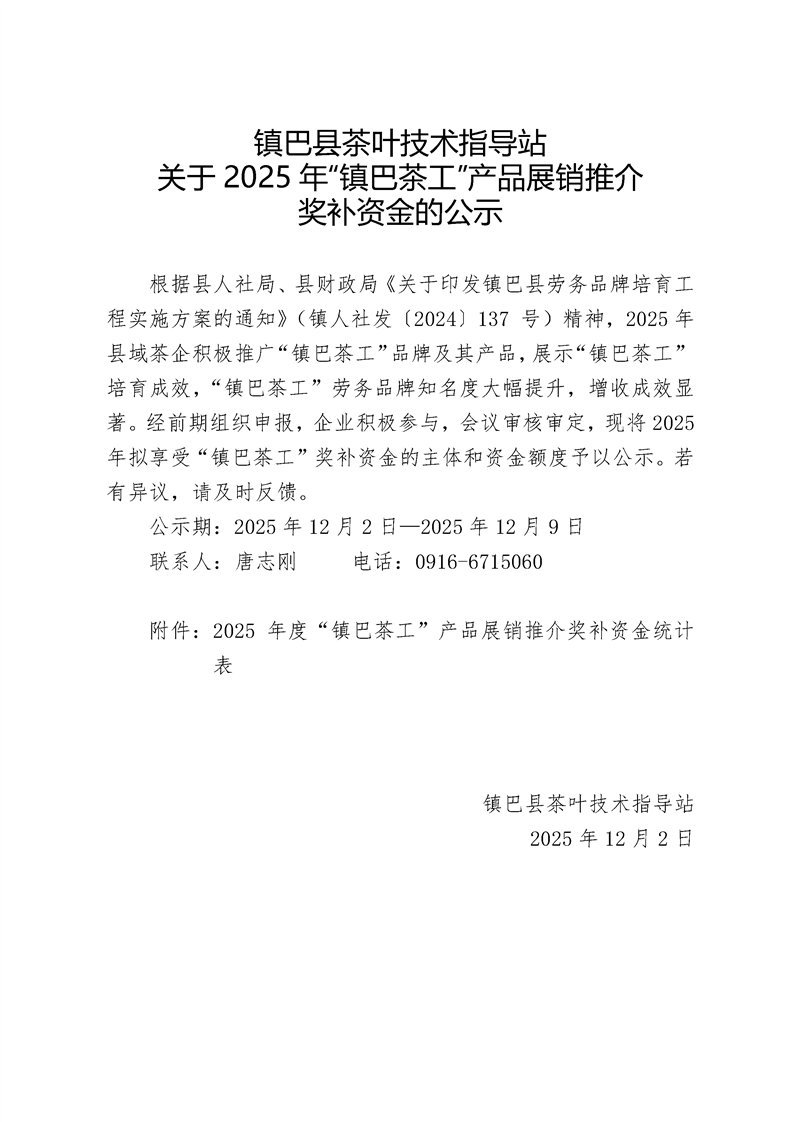 镇巴县茶叶技术指导站关于2025年“镇巴茶工”产品展销推介奖补资金的公示