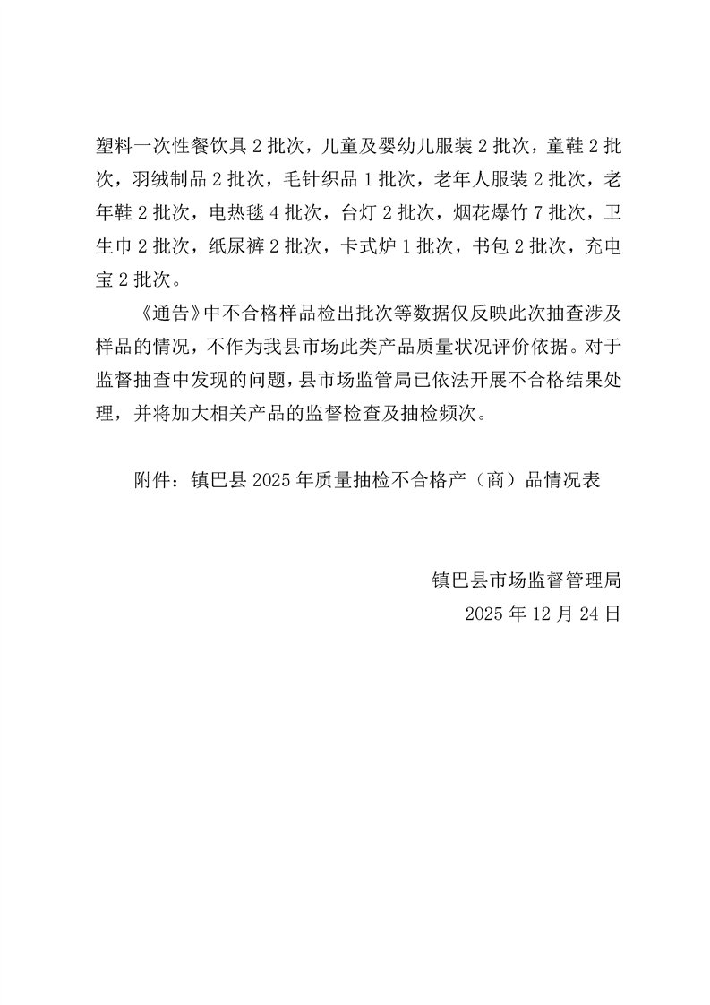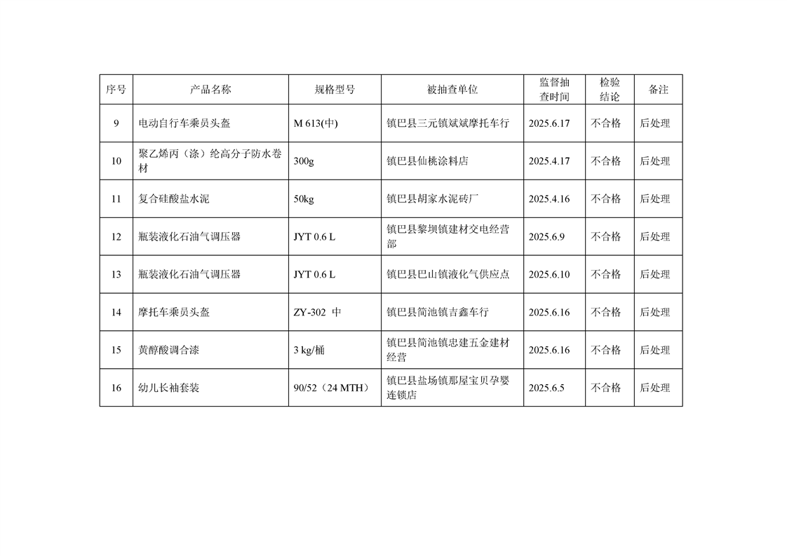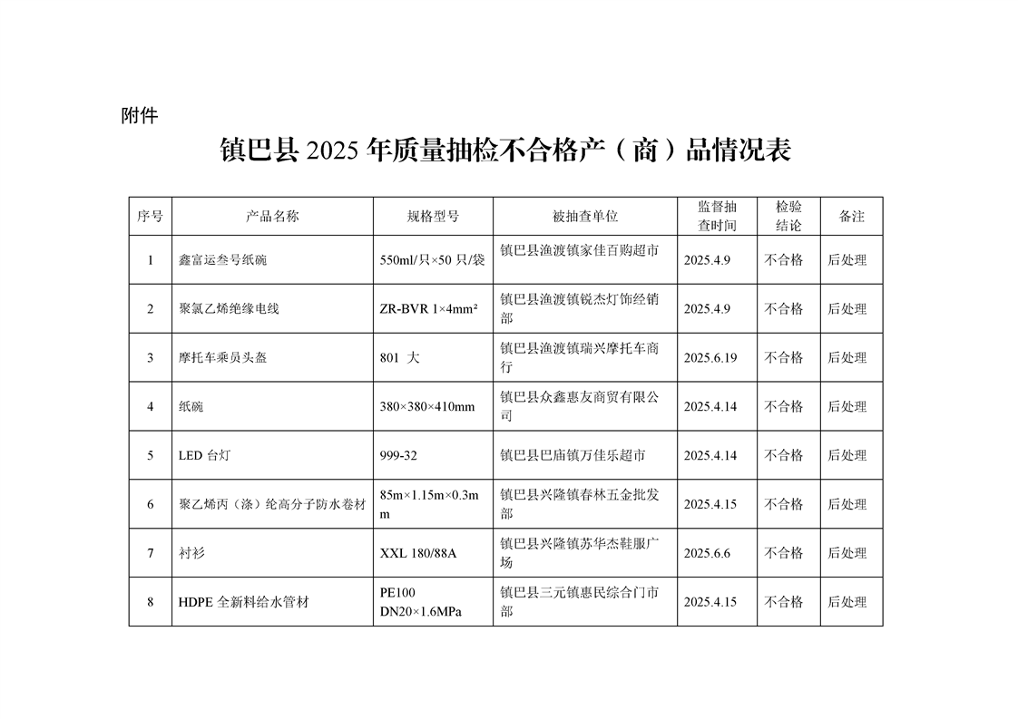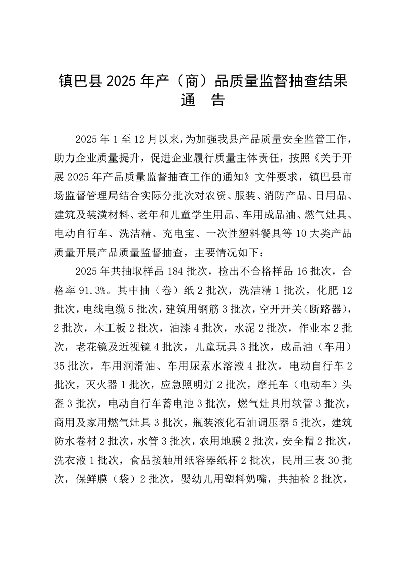 镇巴县2025年产(商)品质量监督抽查结果通告