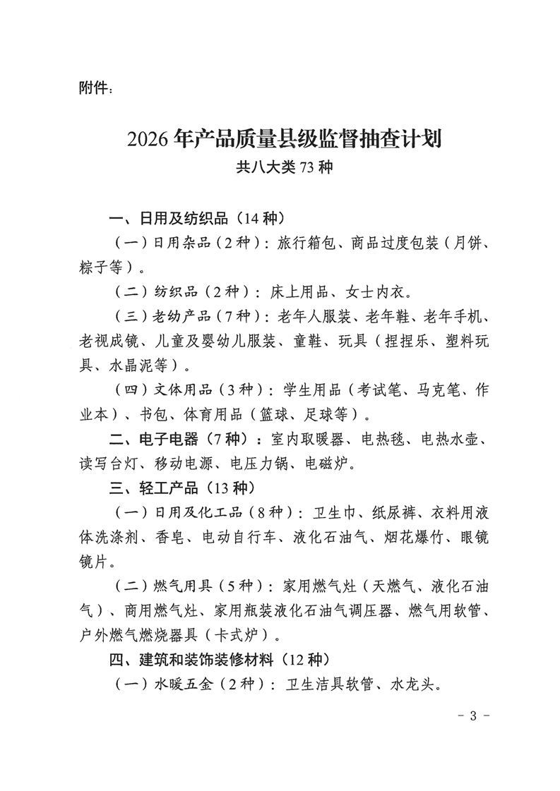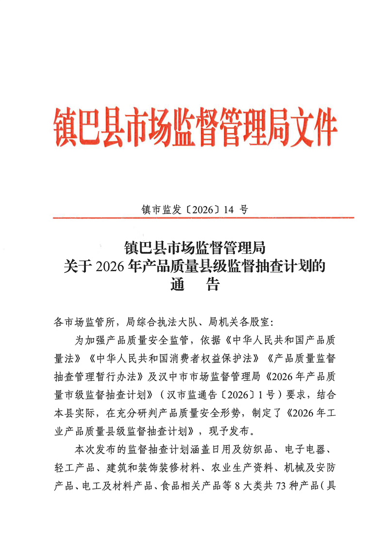 镇巴县市场监督管理局关于2026年产品质量县级监督抽查计划的通告