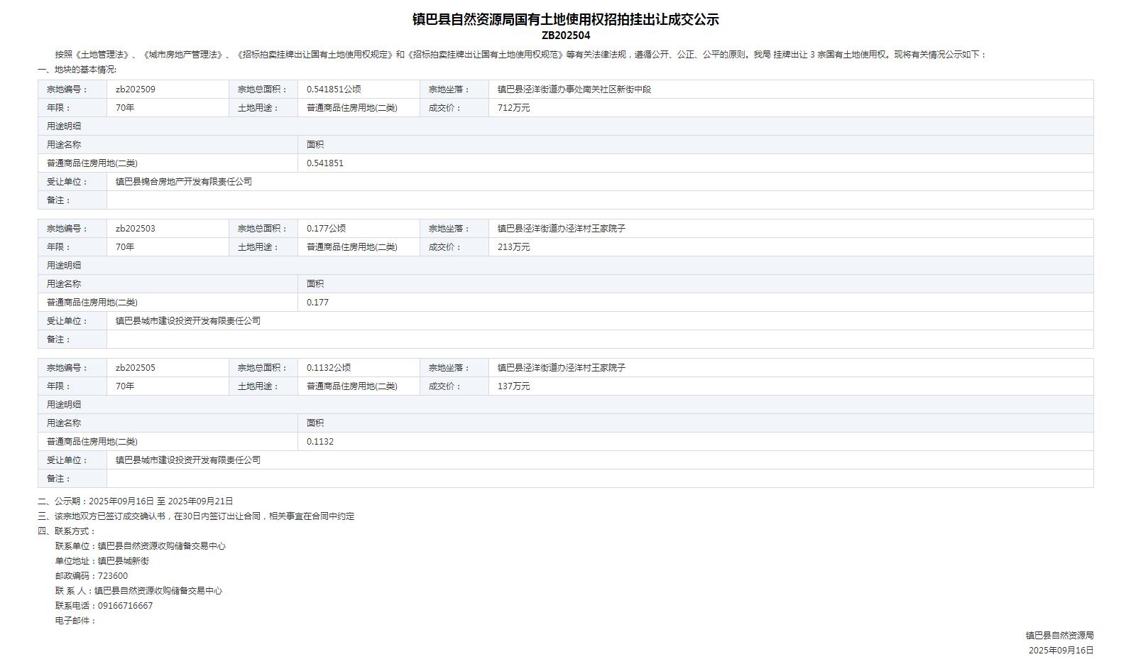 镇巴县自然资源局国有土地使用权招拍挂出让成交公示