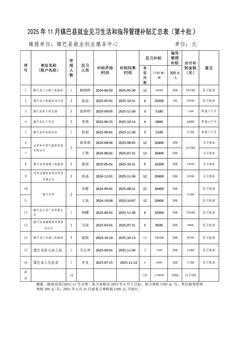关于2025年11月高校毕业生就业见习补贴的公示(第十批)