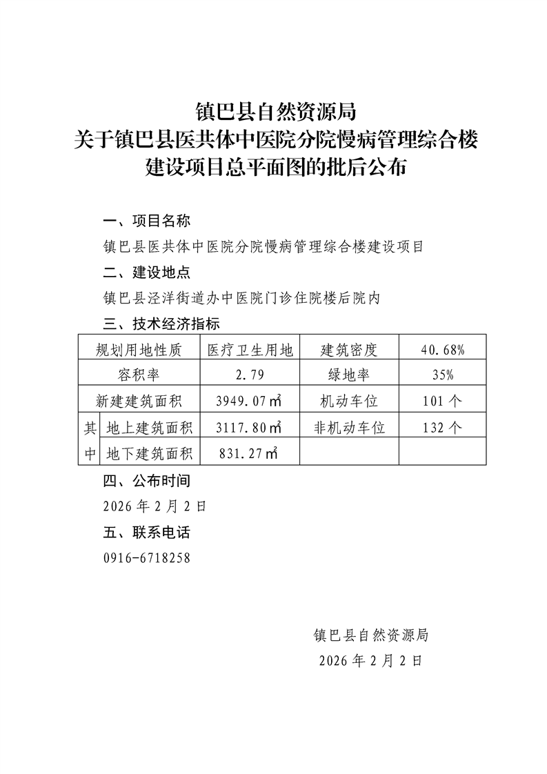 镇巴县自然资源局关于镇巴县医共体中医院分院慢病管理综合楼建设项目总平面图的批后公布
