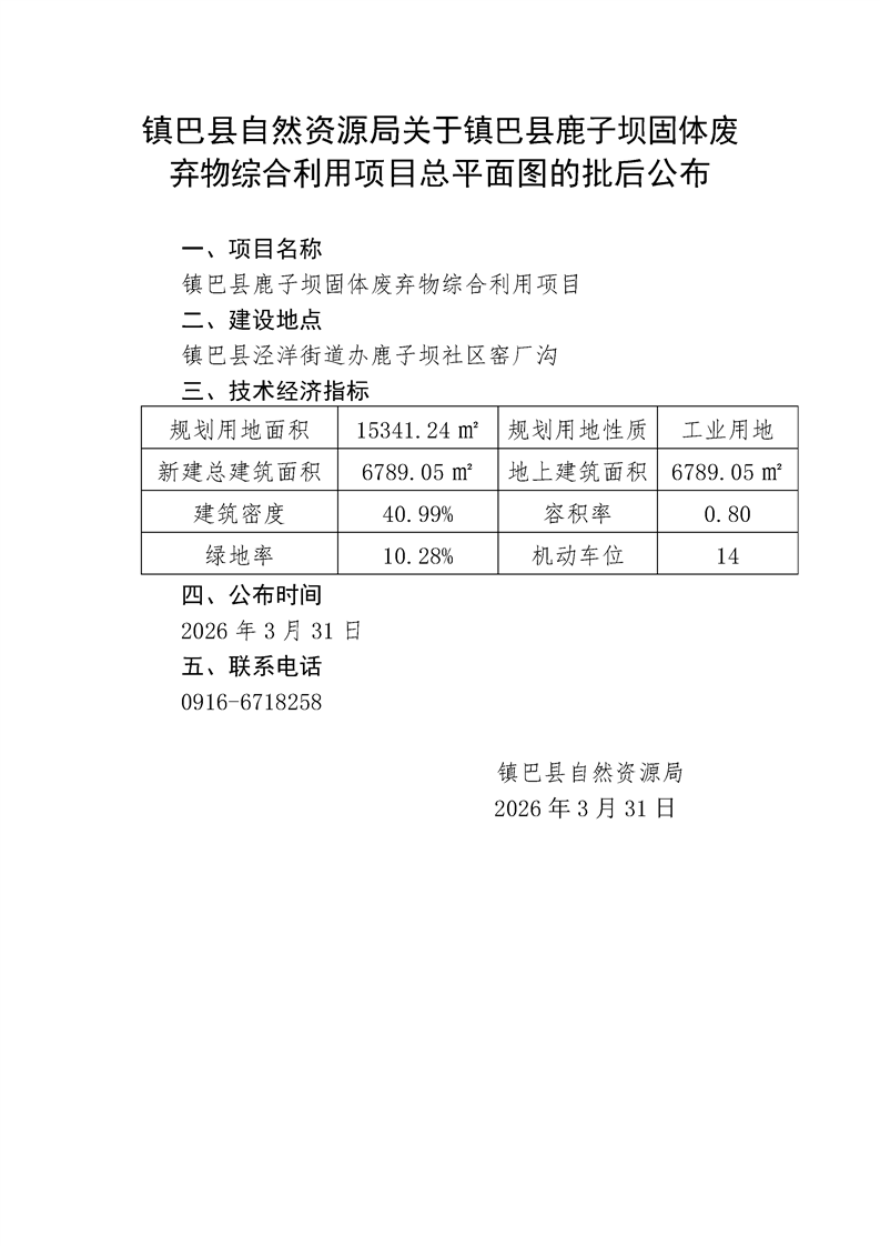 镇巴县自然资源局关于镇巴县鹿子坝固体废弃物综合利用项目总平面图的批后公布