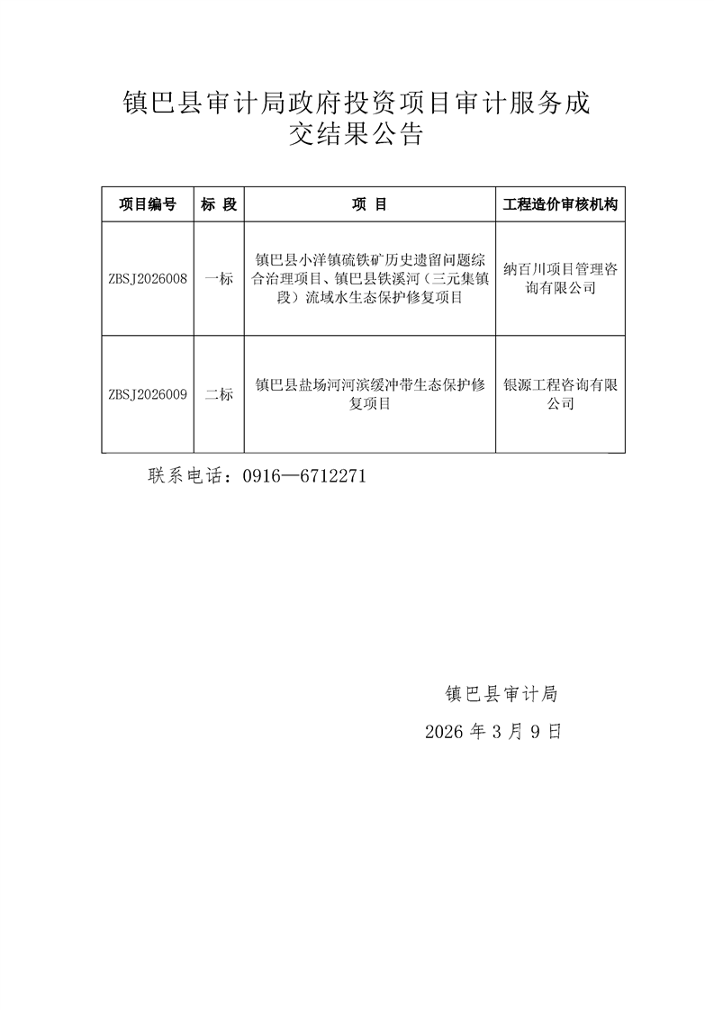 镇巴县审计局政府投资项目审计服务成交结果公告