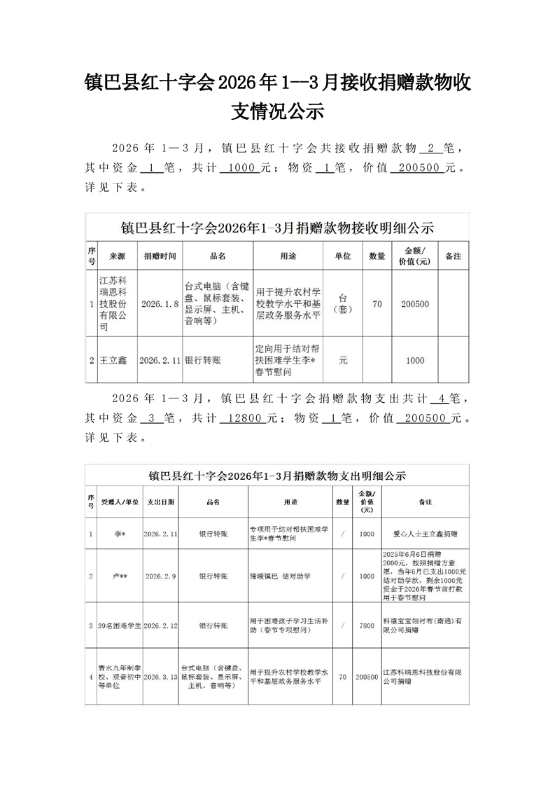 镇巴县红十字会2026年1--3月接收捐赠款物收支情况公示