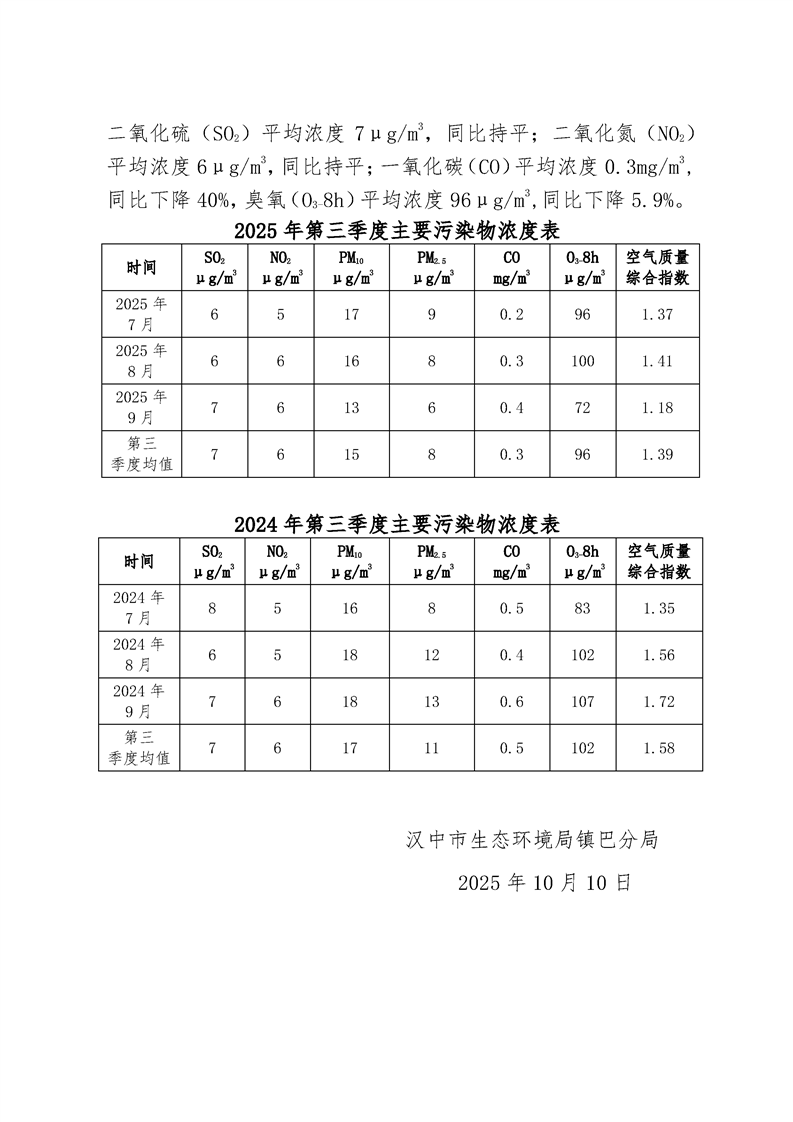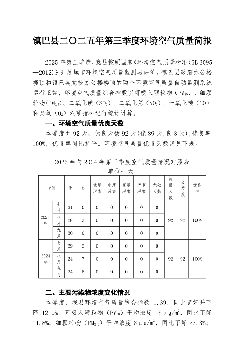 镇巴县二〇二五年第三季度环境空气质量简报