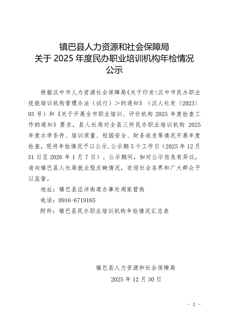 镇巴县人力资源和社会保障局关于2025年度民办职业培训机构年检情况公示