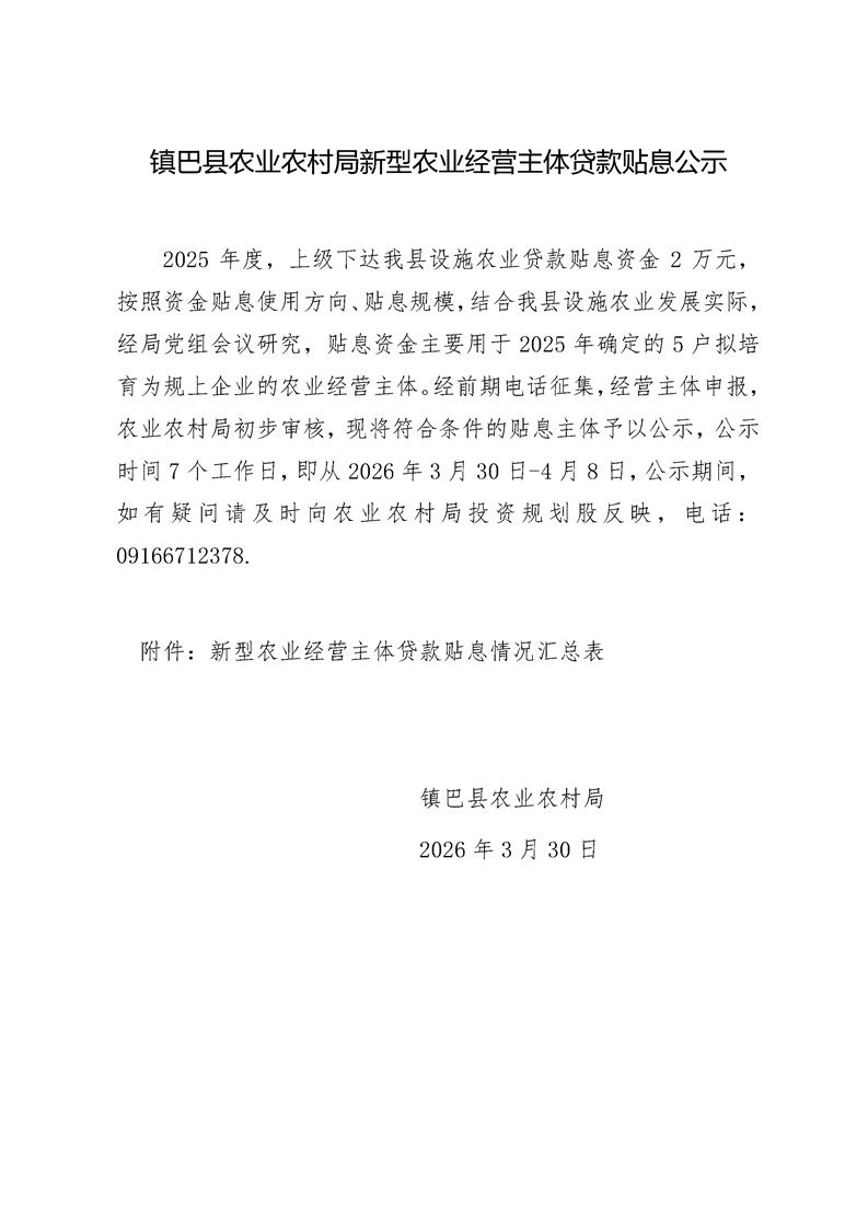 镇巴县农业农村局新型农业经营主体贷款贴息公示