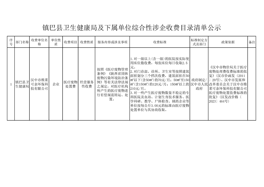 镇巴县卫生健康局及下属单位综合性涉企收费目录清单公示