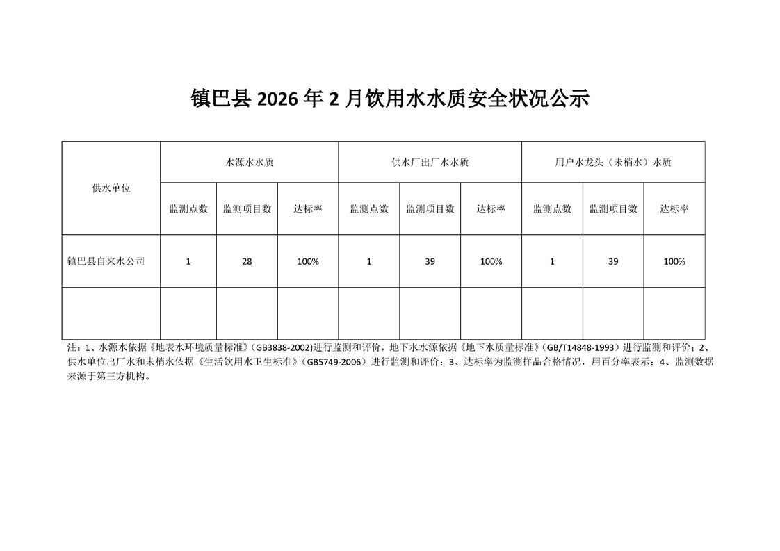 镇巴县2026年2月饮用水水质安全状况公示