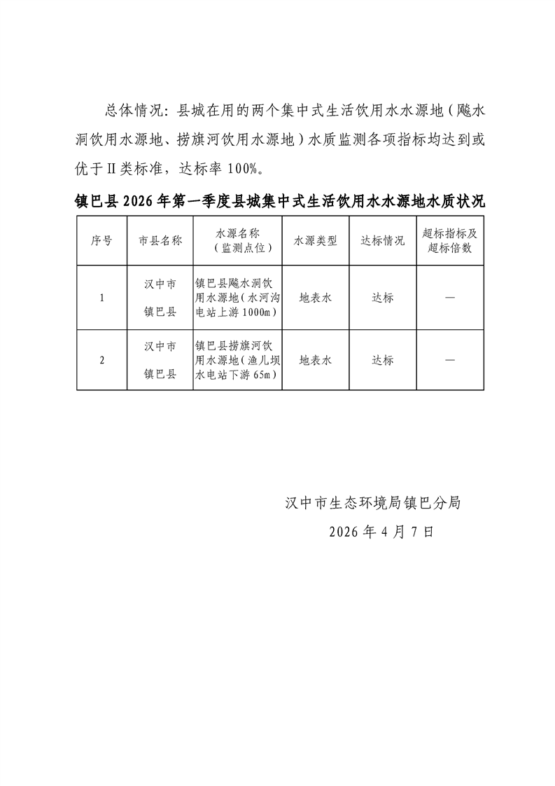 镇巴县二〇二六年第一季度县城集中式生活饮用水水源地水质监测简报