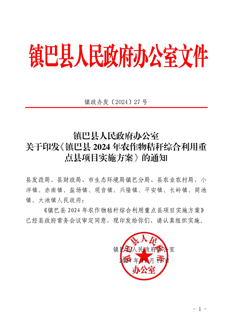镇巴县人民政府办公室关于印发《镇巴县 2024 年农作物秸秆综合利用重点县项目实施方案》的通知