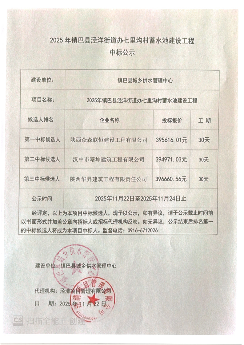 2025 年镇巴县泾洋街道办七里沟村蓄水池建设工程中标公示