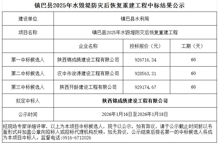 镇巴县2025年水毁堤防灾后恢复重建工程中标结果公示