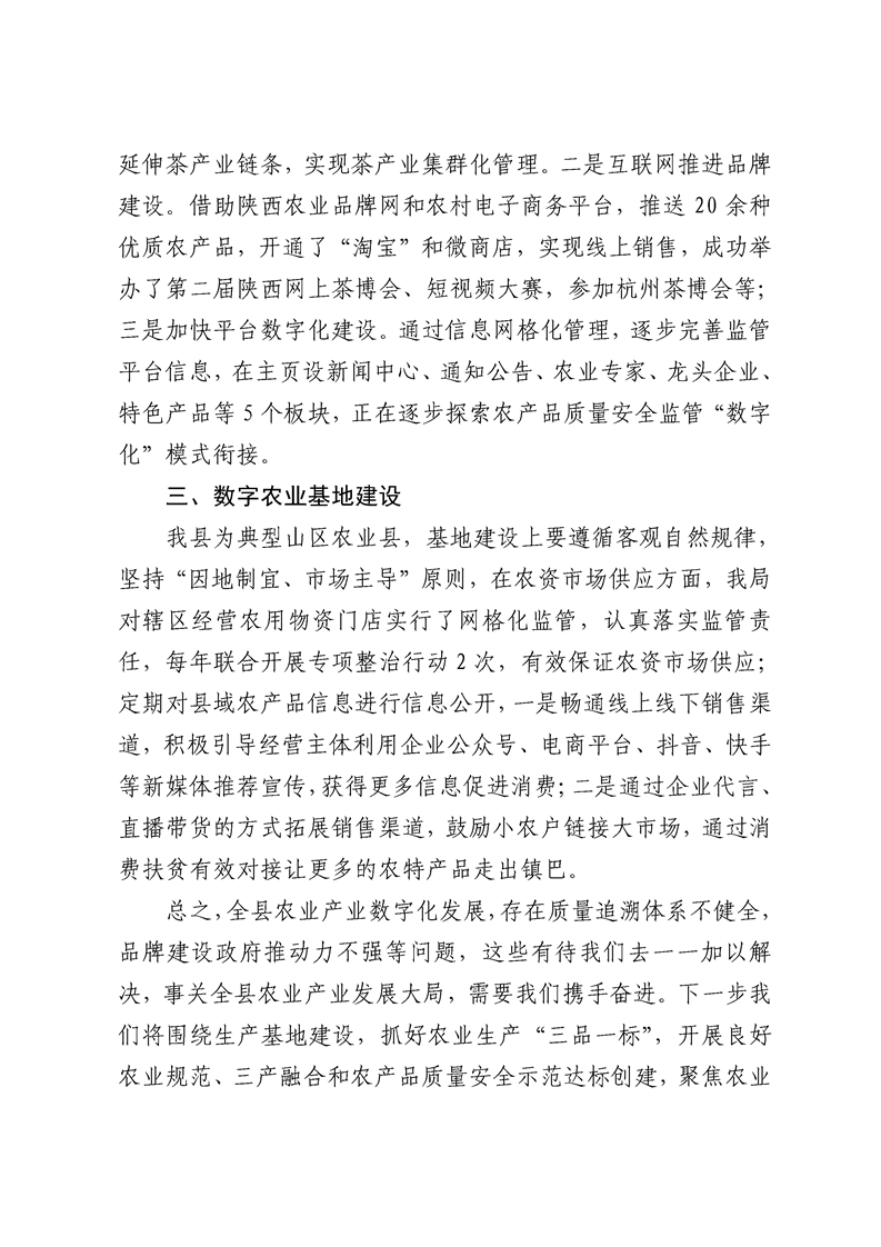 经过5年脱贫攻坚,我县“4+X”产业发展模式已成熟。在产业发展后续方面,如何促进域内产业品牌化、智慧化、科技化、专业化、精细化发展,打造现代产业、智慧农业,提升产业发展质量,推进脱贫攻坚与乡村振兴有效衔接,推进“产业数字化”发展是一个有效途径。