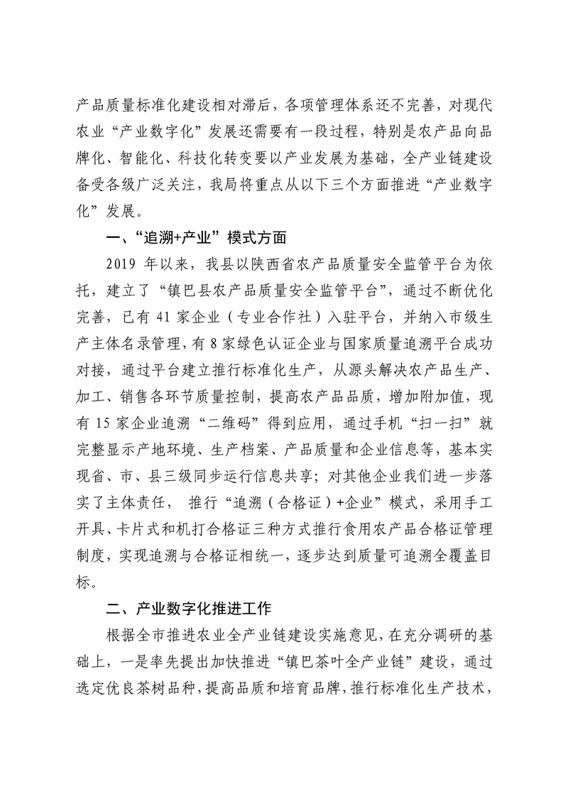 产业数字化,旨在建立镇巴县“4+X”产业数字化体系,为全县茶叶、魔芋、中药材、畜牧四大主导产业及食用菌、蔬果等小众产业量身打造“来源可查、去向可追、责任可究”的数字化溯源体系,建立“从产地直接到家”的线上集中销售模式,实现全县农特产品“一键可查,一键可购”,让数字为产业赋能,实现乡村振兴。 一是建立“追溯+产业”模式。依托已有的镇巴腊肉、大黄、天麻质量追溯体系,打造产品溯源、质量监管、公众查询等功能齐备的“追溯+产业”发展模式,以“短视频+图+文+直播+二维码”等形式展示生于田野山水间的产业实景,展示产品生产全流程,实现农特产品统一品质、统一标准、统一防控。 二是建立镇巴“4+X”产业数字化“白皮书”。“白皮书”囊括所有镇巴特色产品,线下线上同时推出,一件产品一个二维码,一个二维码一个产业链,集中展示、集成推介,让所有到镇巴的客人“手中只要有一页白皮书,镇巴特产便能一键带回家”;没到过镇巴客人“线上一点白皮书,镇巴特产送到家。” 三是建立“数字农业基地”。整合县内农特产品,统一收购,统一配送;建立既适应规模化公司、也兼顾小种小养和普通农户的准入条件和管理措施;同城建立“从产地直接送到家”线上选购模式,异地建立销售网络,让买家方便买,卖家不愁卖。 |