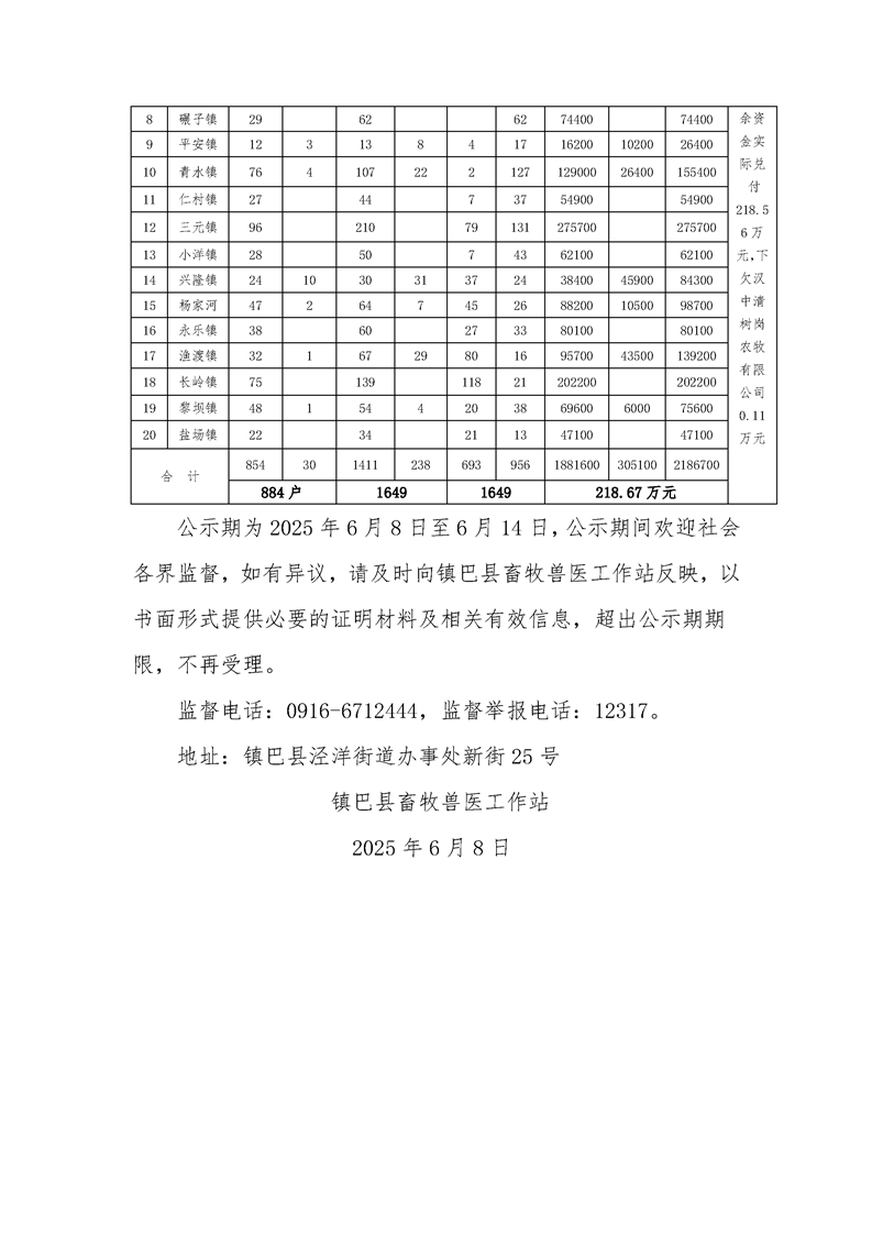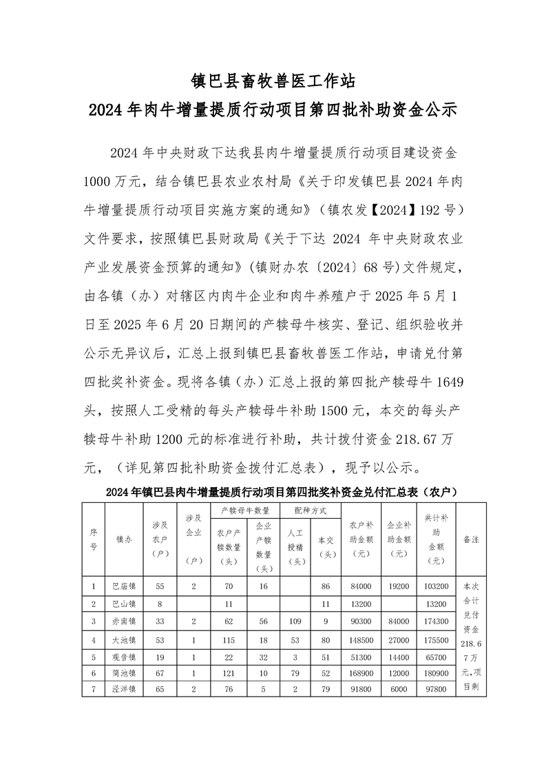镇巴县畜牧兽医工作站2024年肉牛增量提质行动项目第四批补助资金公示
