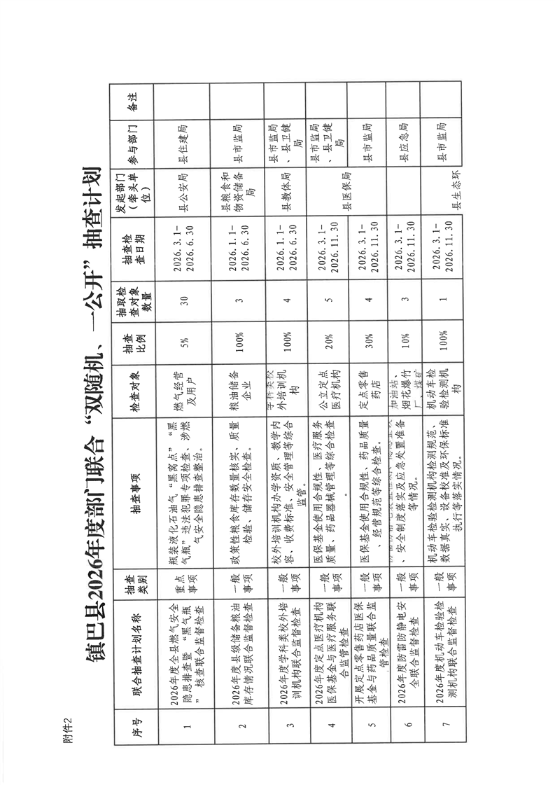 镇巴县双随机、一公开监管工作联席会议办公室关于印发镇巴县2026年度“双随机、一公开”第一批抽查计划的通知