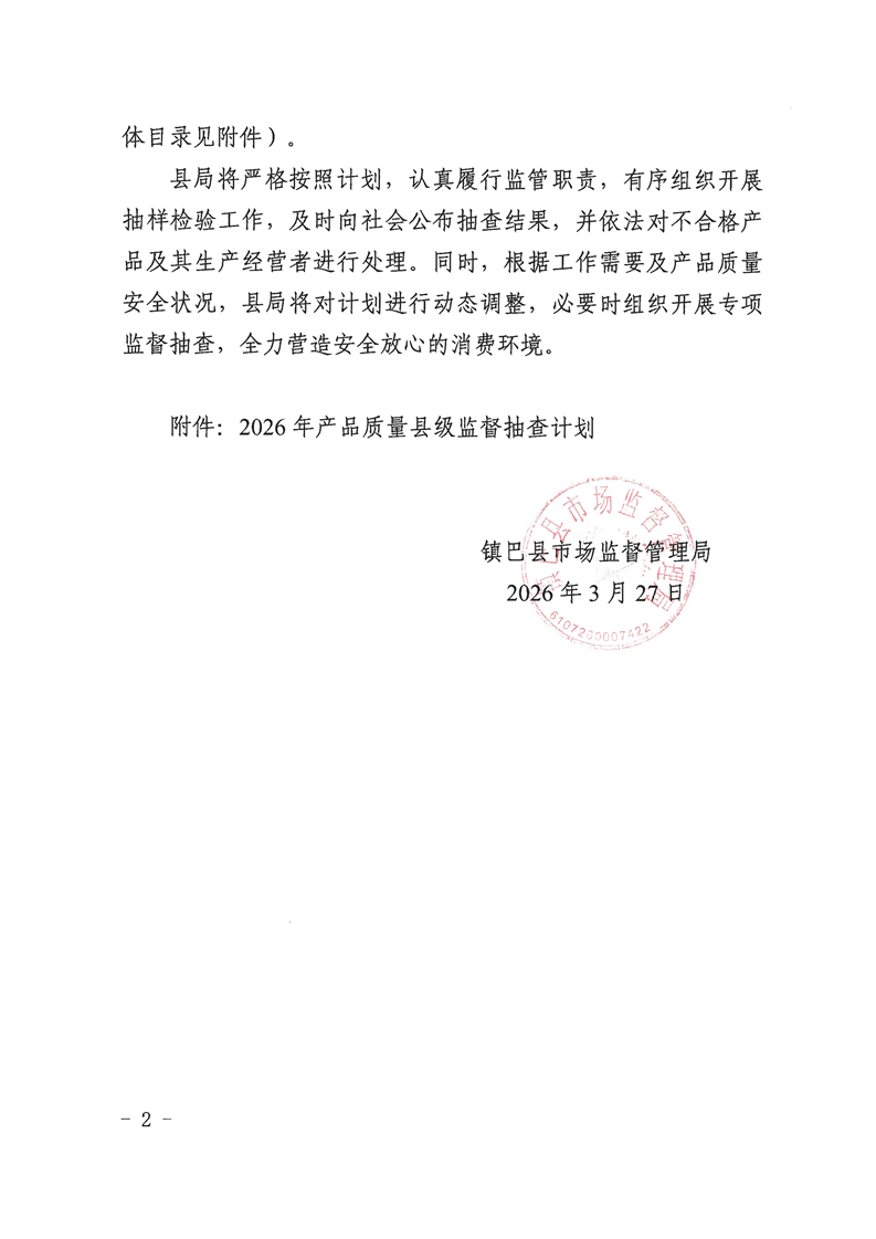 镇巴县市场监督管理局关于2026年产品质量县级监督抽查计划的通告