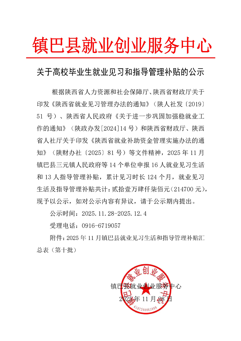关于2025年11月高校毕业生就业见习补贴的公示(第十批)