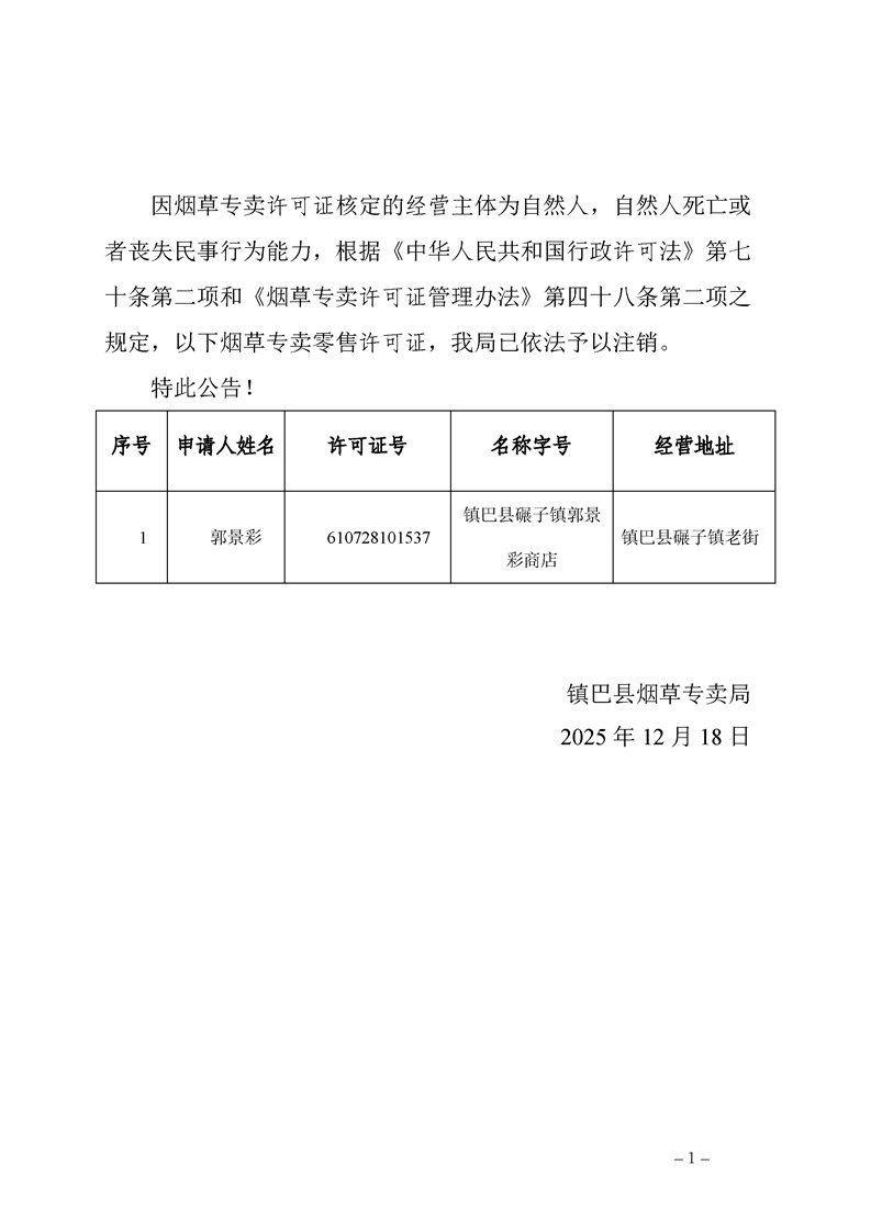 镇巴县烟草专卖局注销烟草专卖零售许可证公告