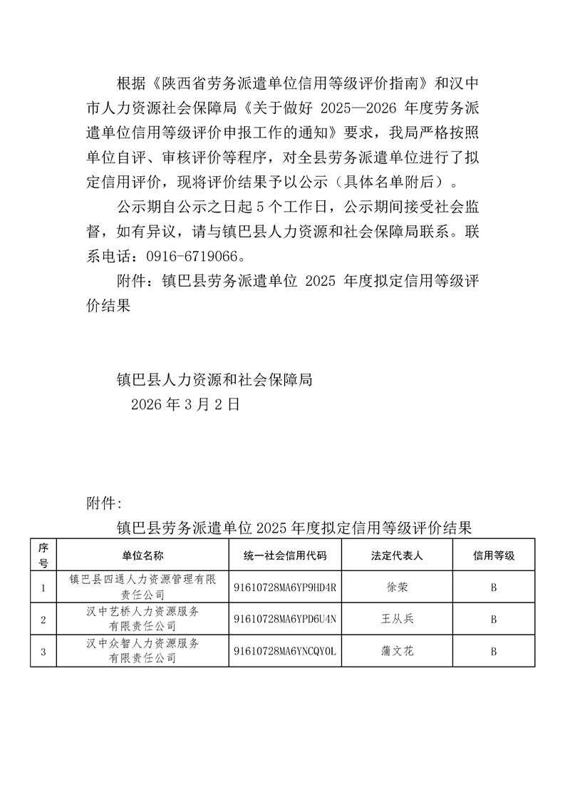 镇巴县人力资源和社会保障局关于镇巴县劳务派遣单位2025年度拟定信用等级评价结果的公示