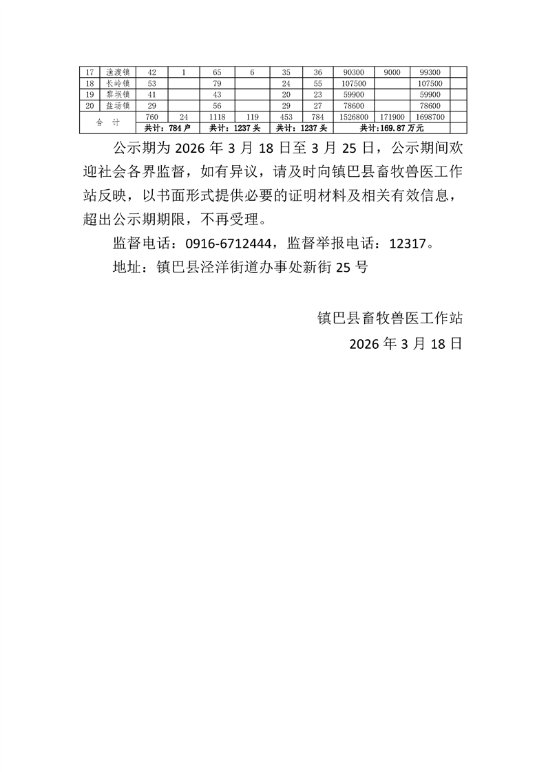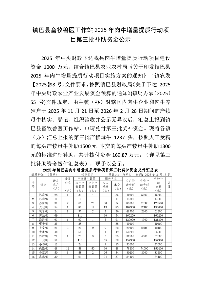 镇巴县畜牧兽医工作站2025年肉牛增量提质行动项目第三批补助资金公示