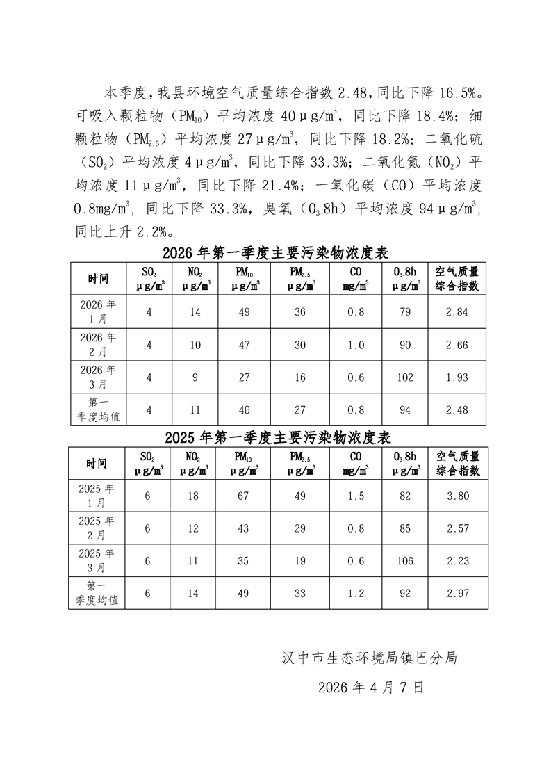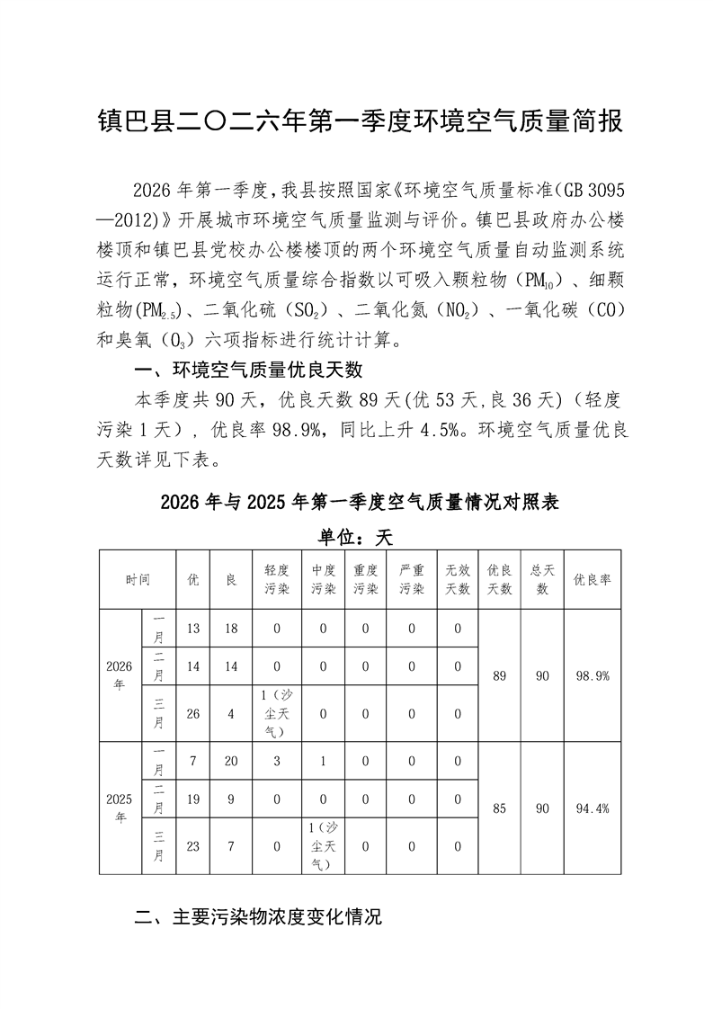 镇巴县二〇二六年第一季度环境空气质量简报