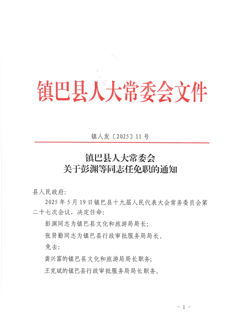 镇巴县人大常委会关于彭渊等同志免职的通知