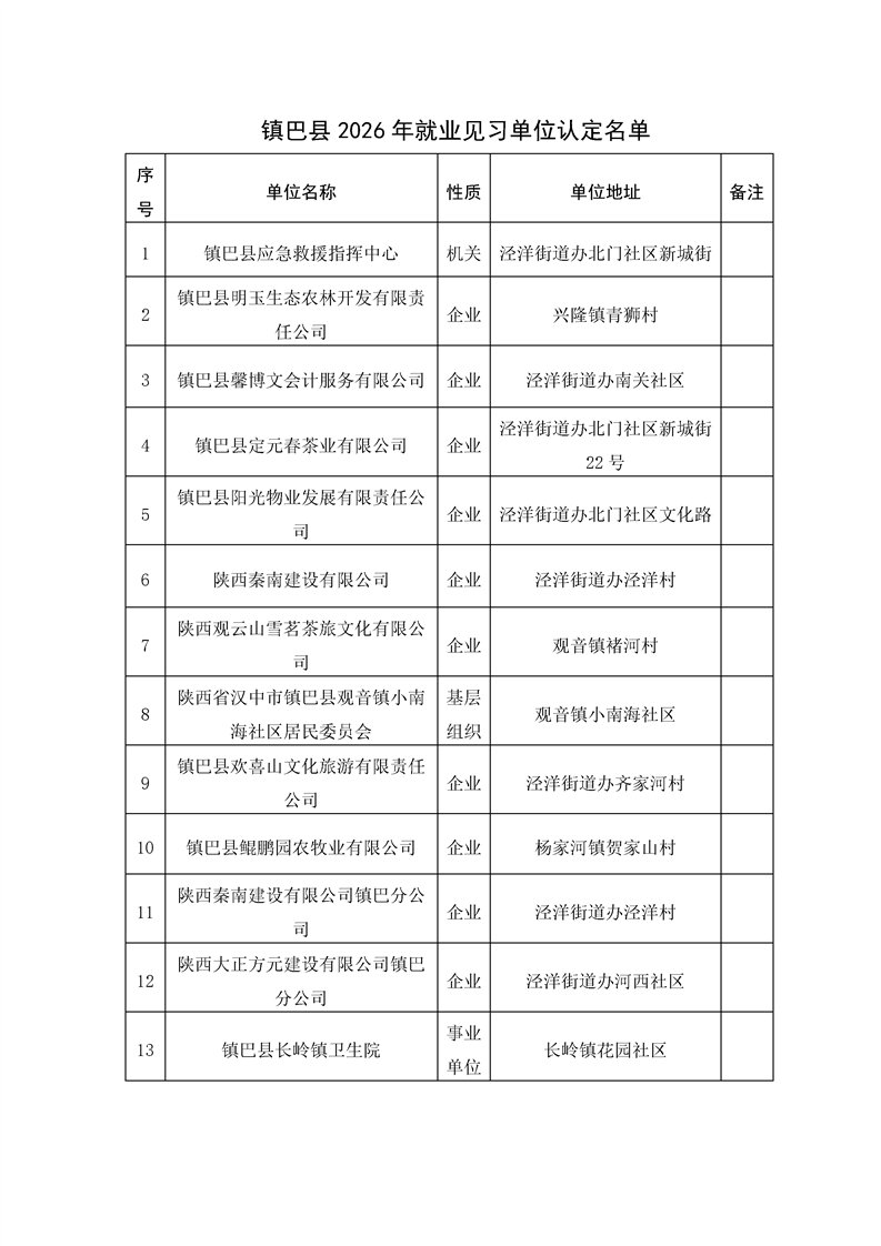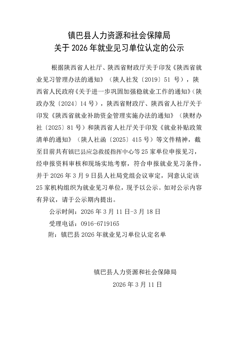镇巴县人力资源和社会保障局关于2026年就业见习单位认定的公示