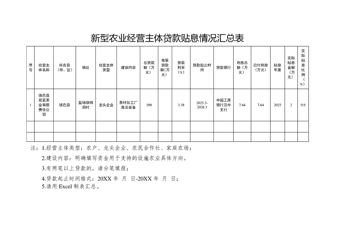 镇巴县农业农村局新型农业经营主体贷款贴息公示