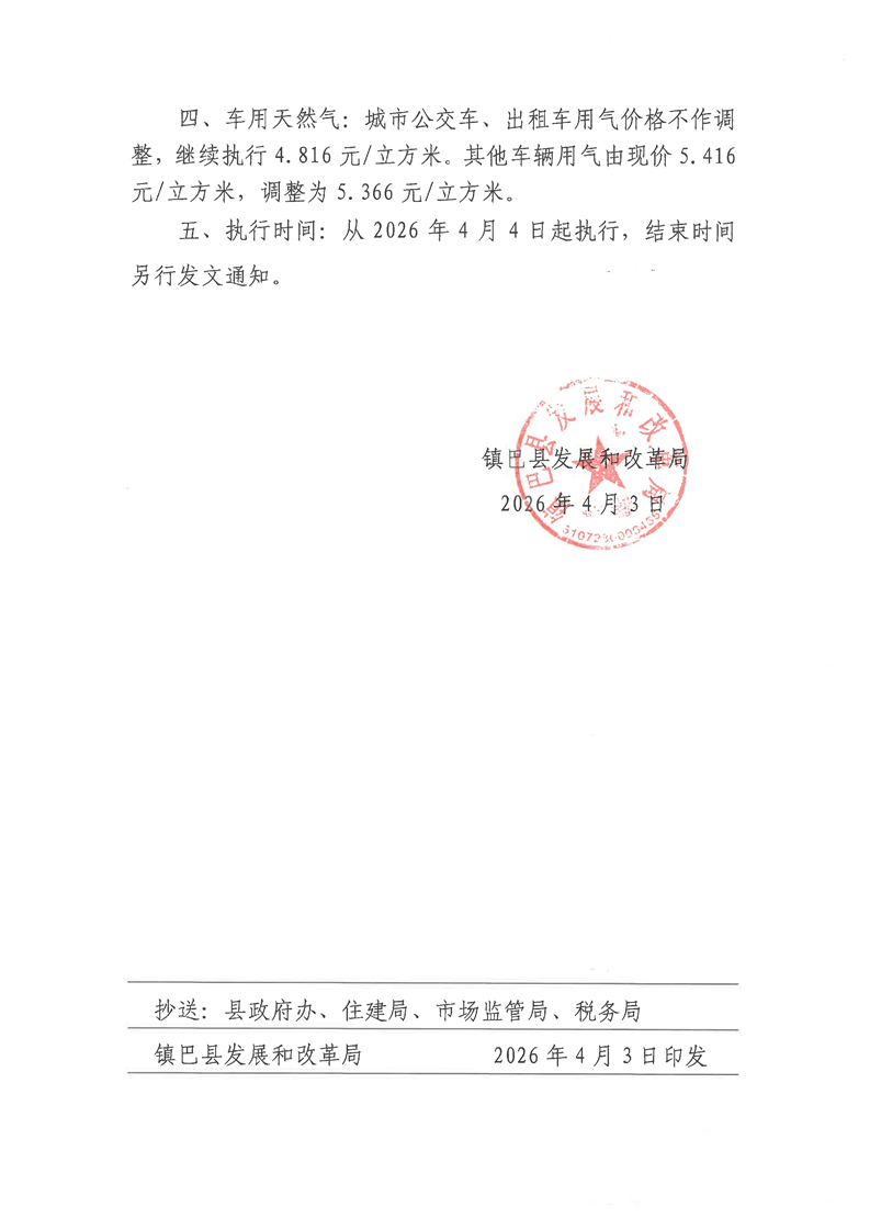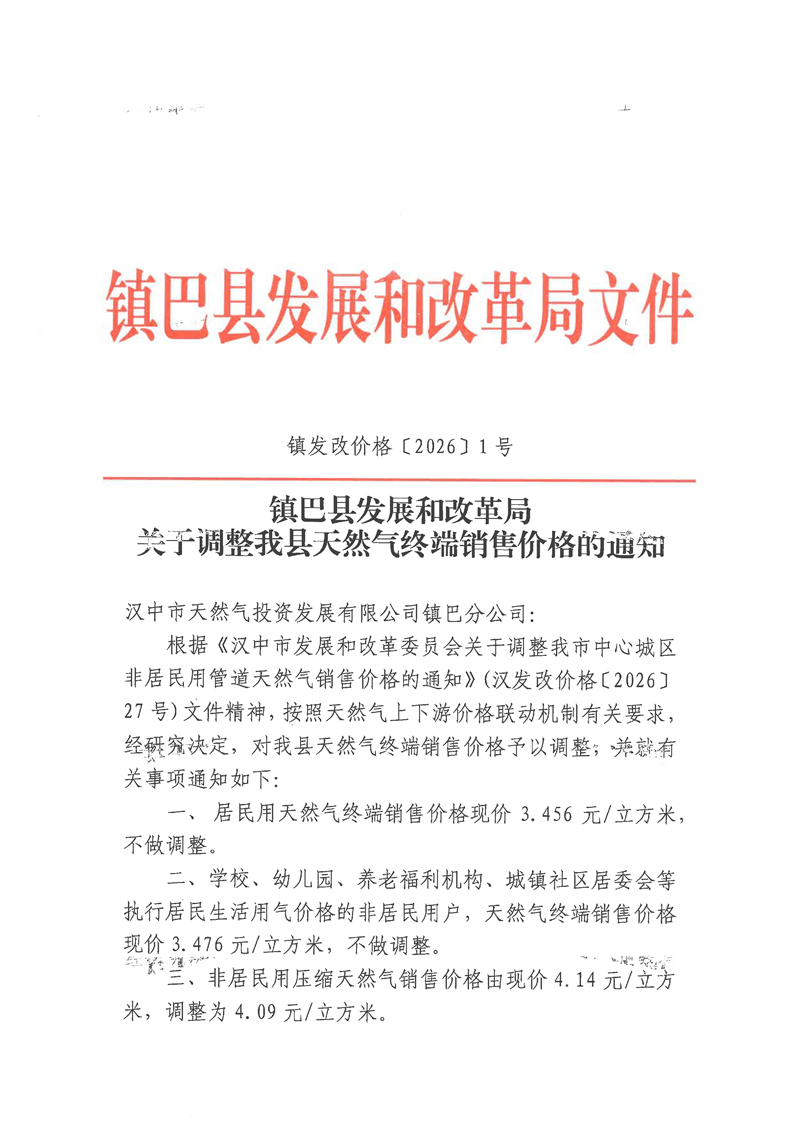 镇巴县发展和改革局关于调整我县天然气终端销售价格的通知