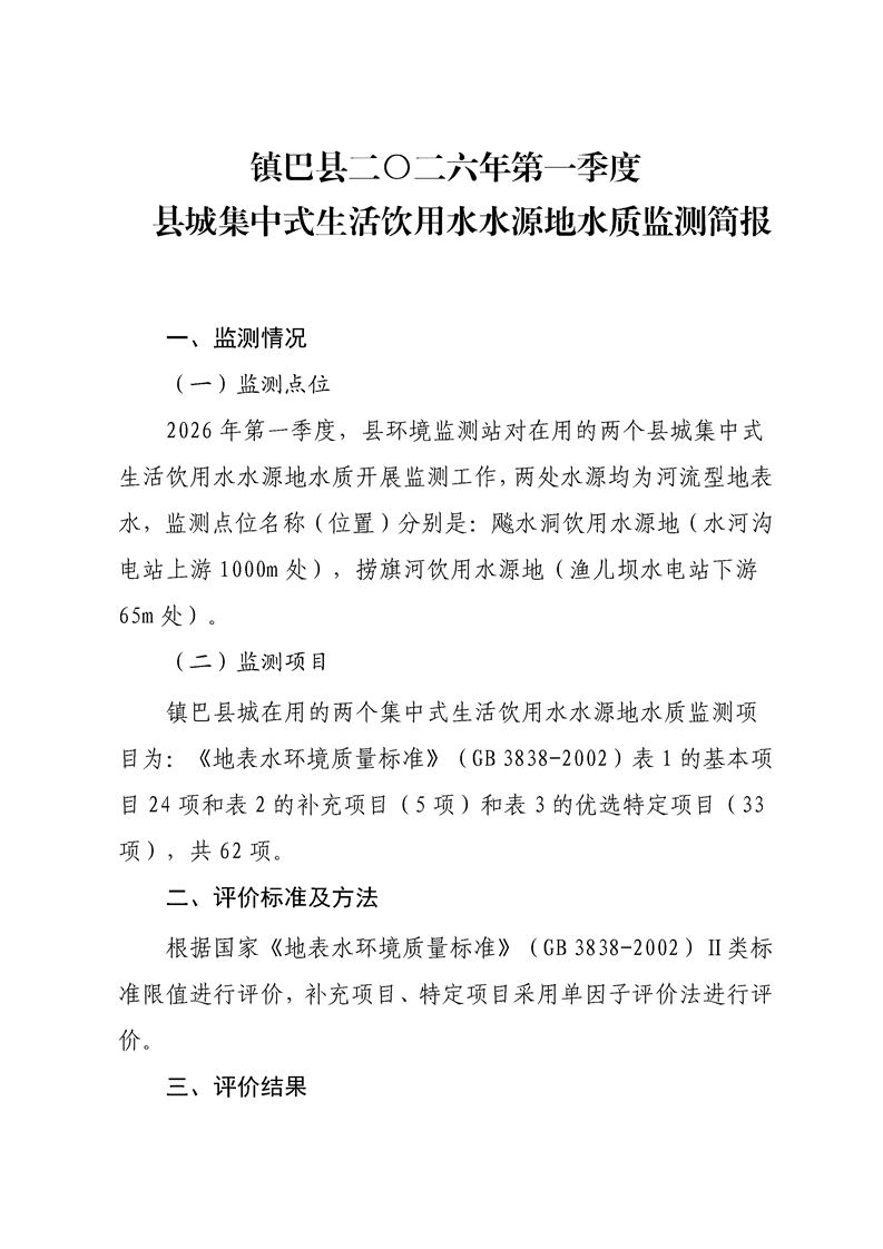 镇巴县二〇二六年第一季度县城集中式生活饮用水水源地水质监测简报