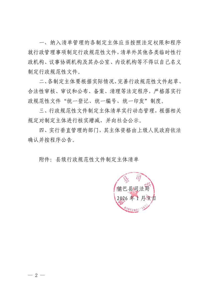 镇巴县司法局关于印发县级行政规范性文件制定主体清单(2025版)的通知