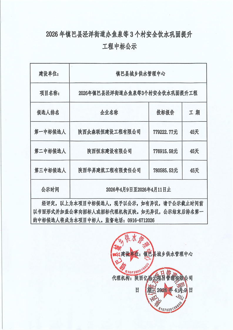 2026年镇巴县泾洋街道办鱼泉等3个村安全饮水巩固提升工程中标公示