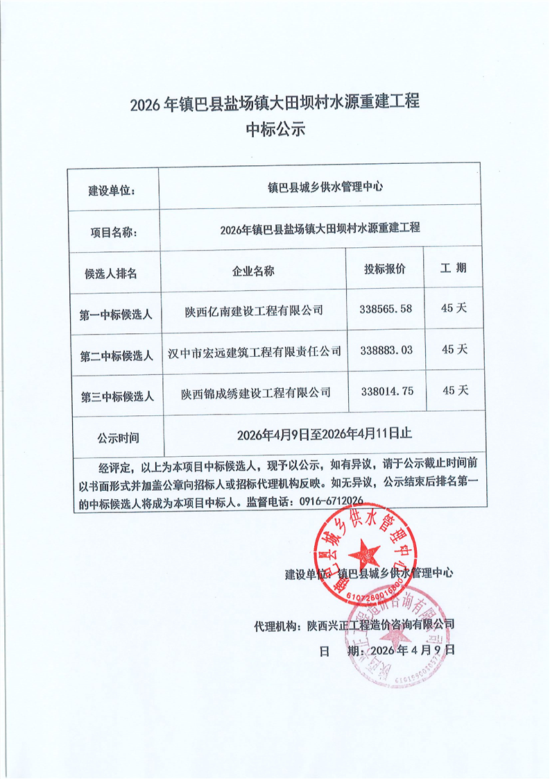 2026年镇巴县盐场镇大田坝村水源重建工程中标公示